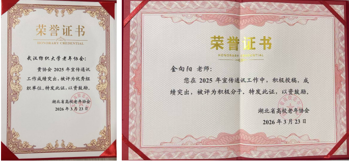 在今年3月23--25日召开的湖北省高校老年协会宣传工作会议上,我校凭借出色的宣传组织工作,被授予“湖北省高校老年协会宣传通讯工作优秀组织单位”;退休教授金向阳在“湖北省高校老年协会”公众号和《湖北高校老年通讯》两大平台上发表稿件数量与质量收获“双高”,被评为“湖北省高校老年协会宣传通讯工作积极分子”。此次共有包括教育部直属高校的21所大学和28名积极通讯员获得表彰,武汉纺织大学是荣获集体和个人双项荣誉的单位之一。
